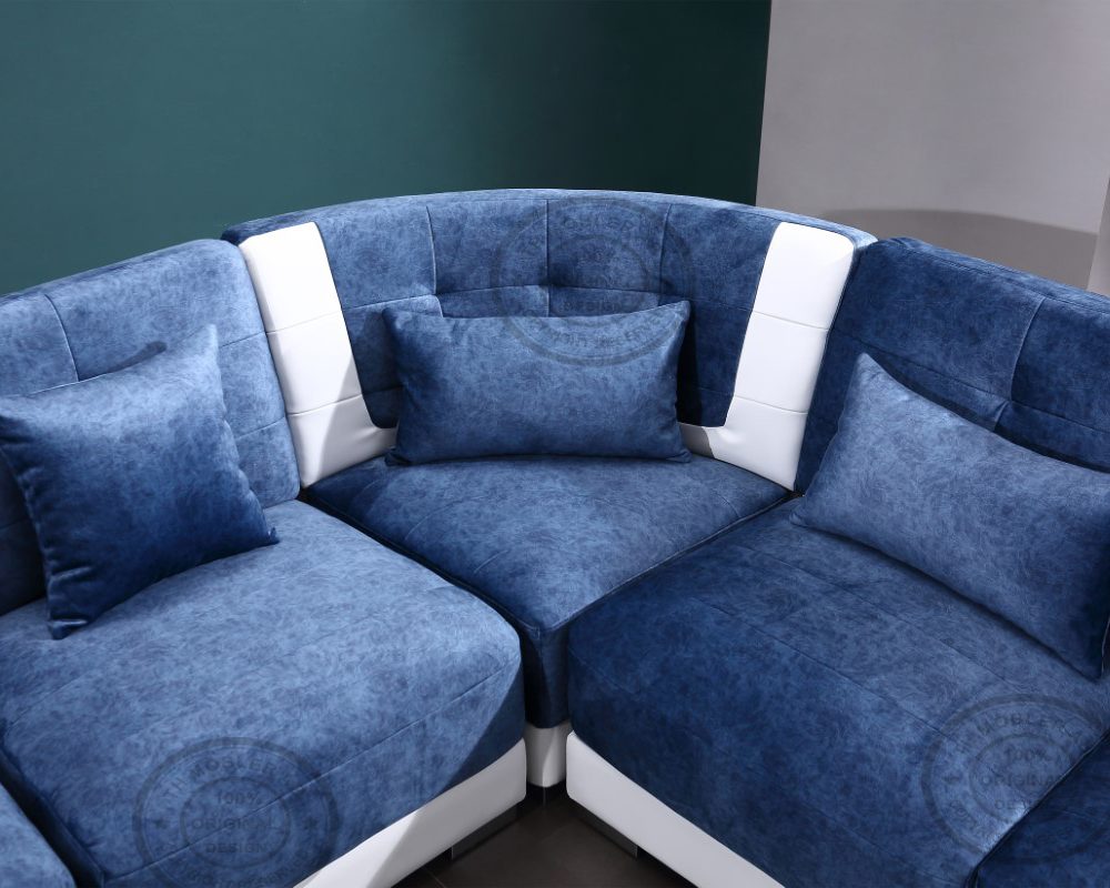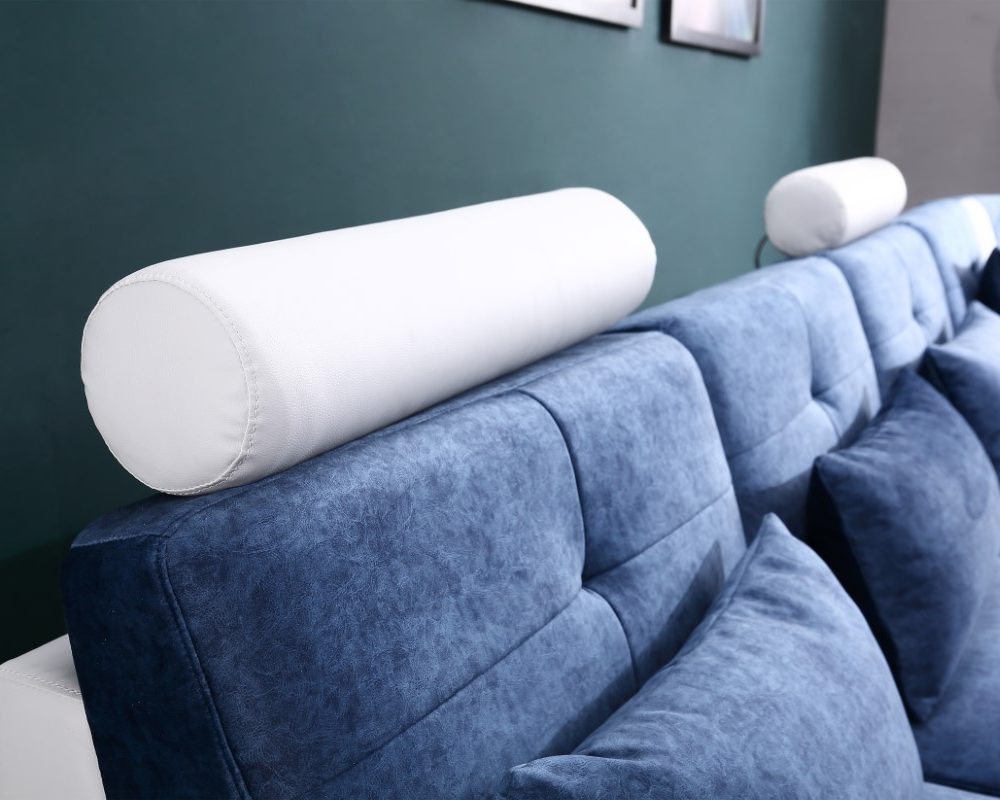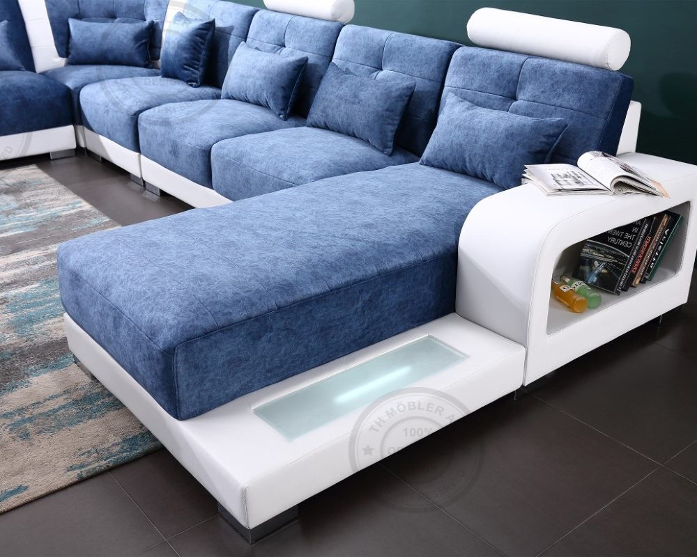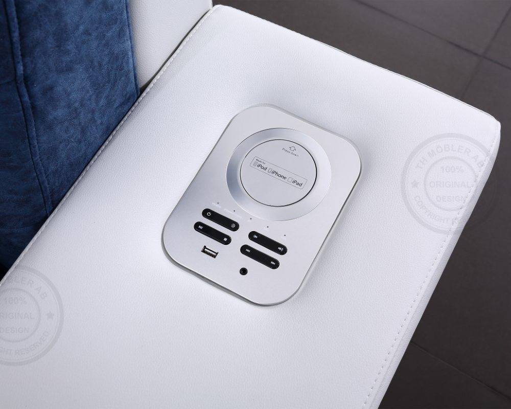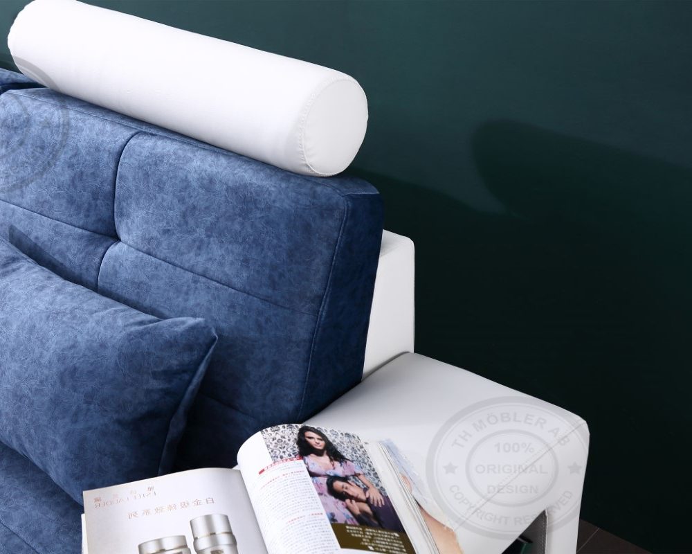 Alicante är en modern designad divan soffa i sammet tyg för framtiden. Soffan har tre nackstöd, förvaringsplats, mediaspelare, bluetooth uppkoppling, mobil laddning samt hela 6 avlånga kuddar i samma färg som följer med .