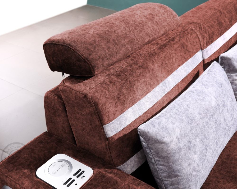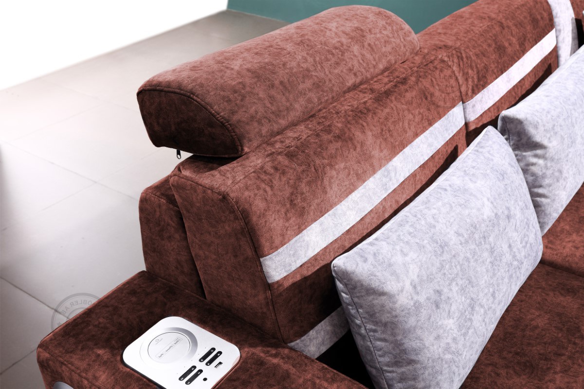 Angi soffa är en lagom stor soffa som kommer med högtalare, Bluetooth uppkoppling, USB samt mobil laddare.