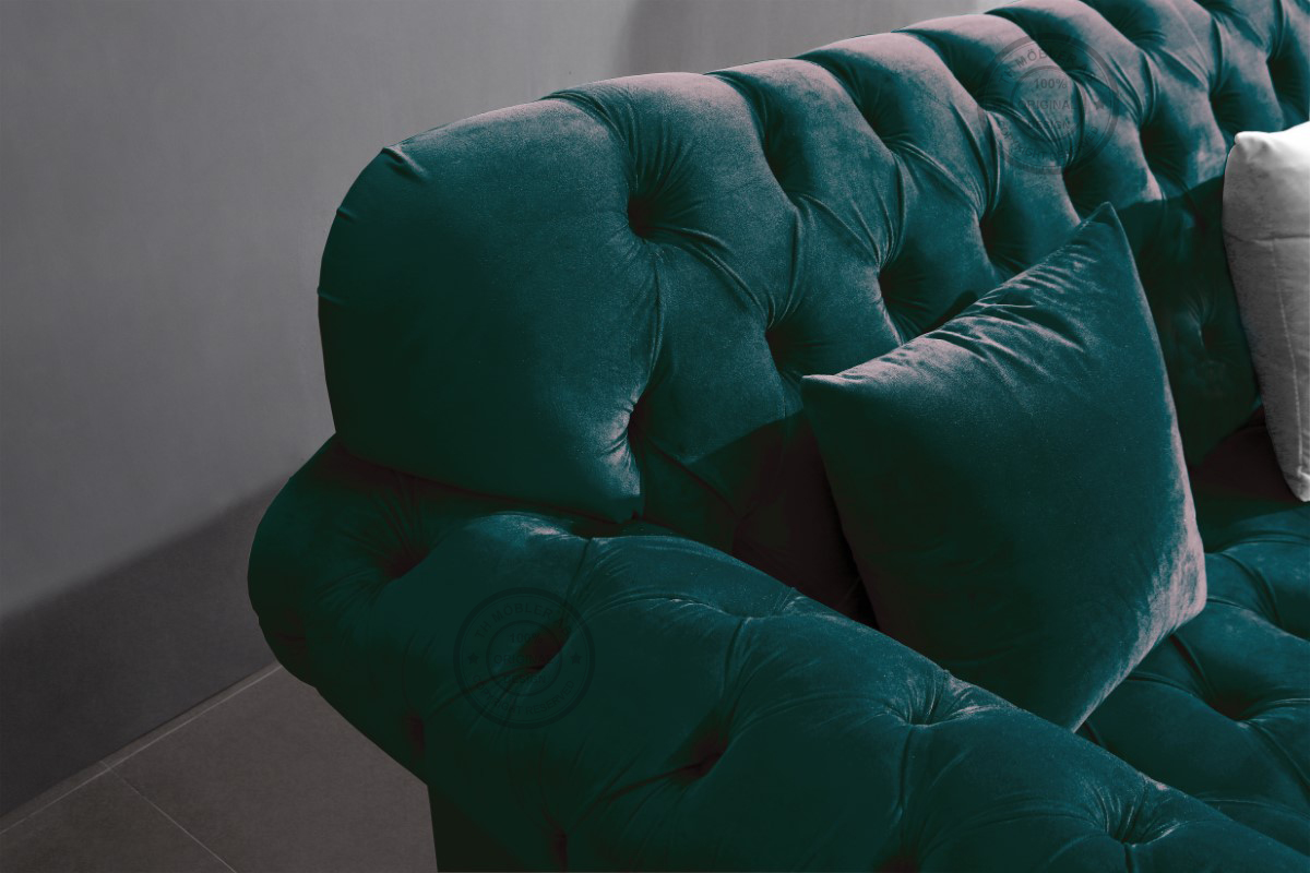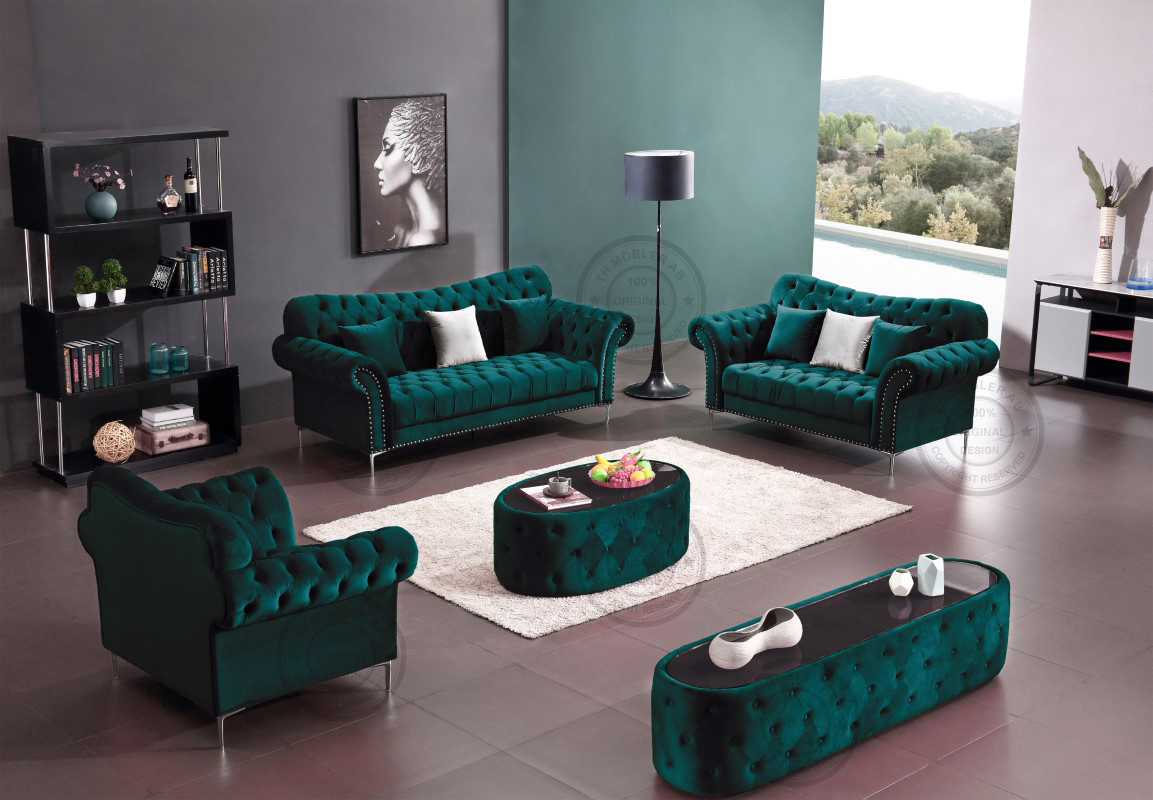 Soffan säljs främst i sammet tyg, den har rostfri metallben.