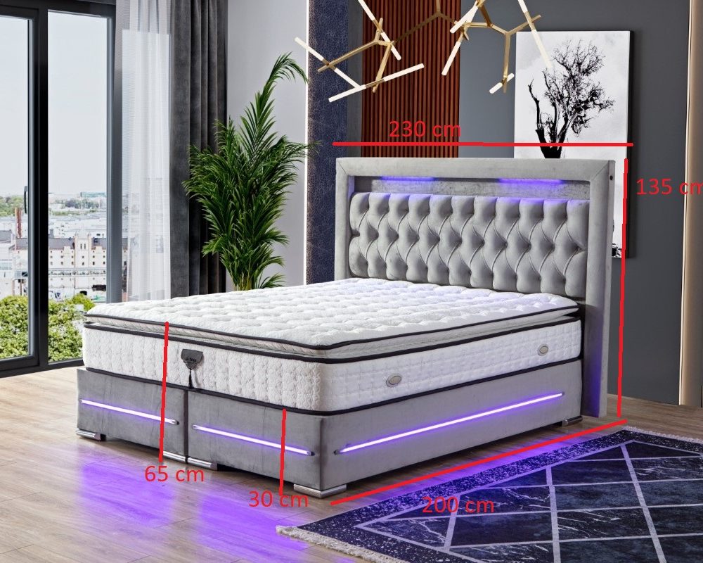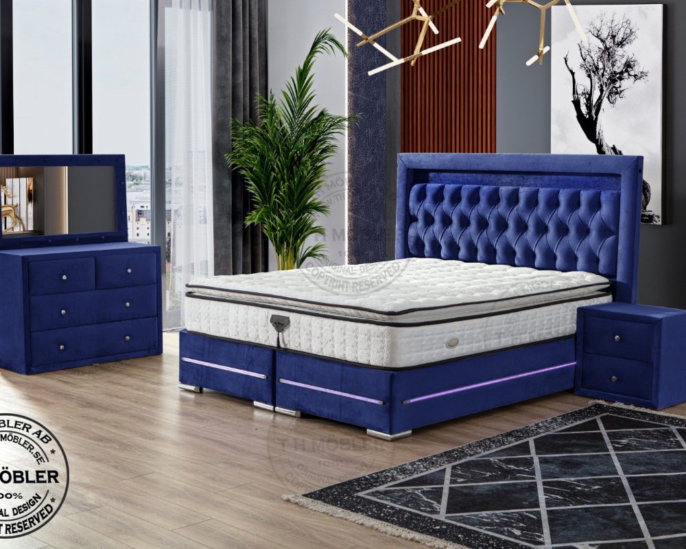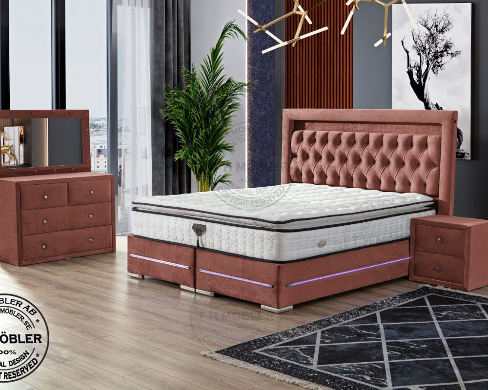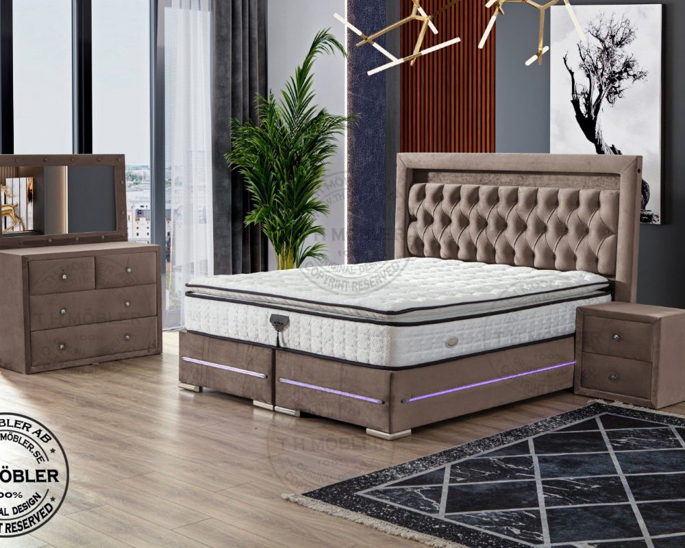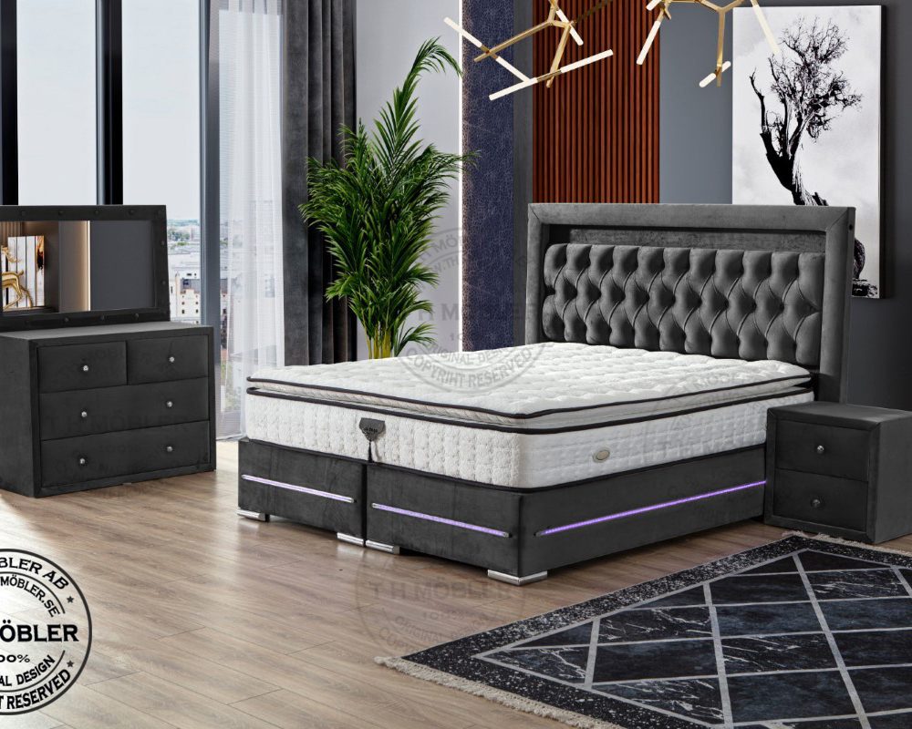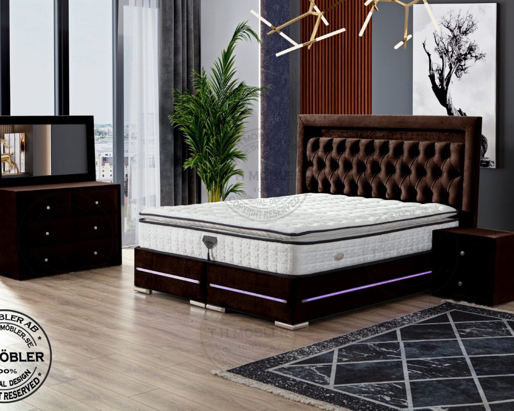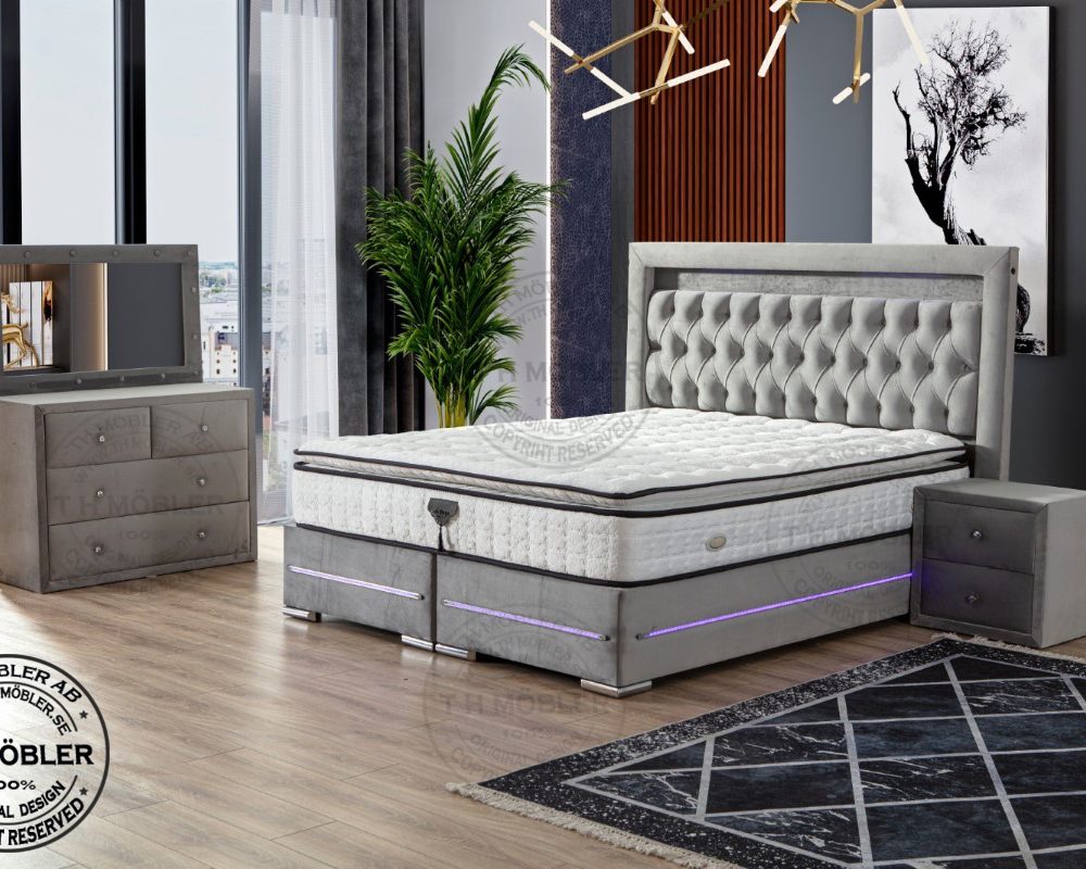 Sängen är uppbyggd med 2 st. 90 cm breda sängbottnar. Varje Sängbotten är byggd i 12 cm massiv träram i fingerskarvat furuträ klätt i ett slitstarkt tyg samt led belysning runtom ramen.