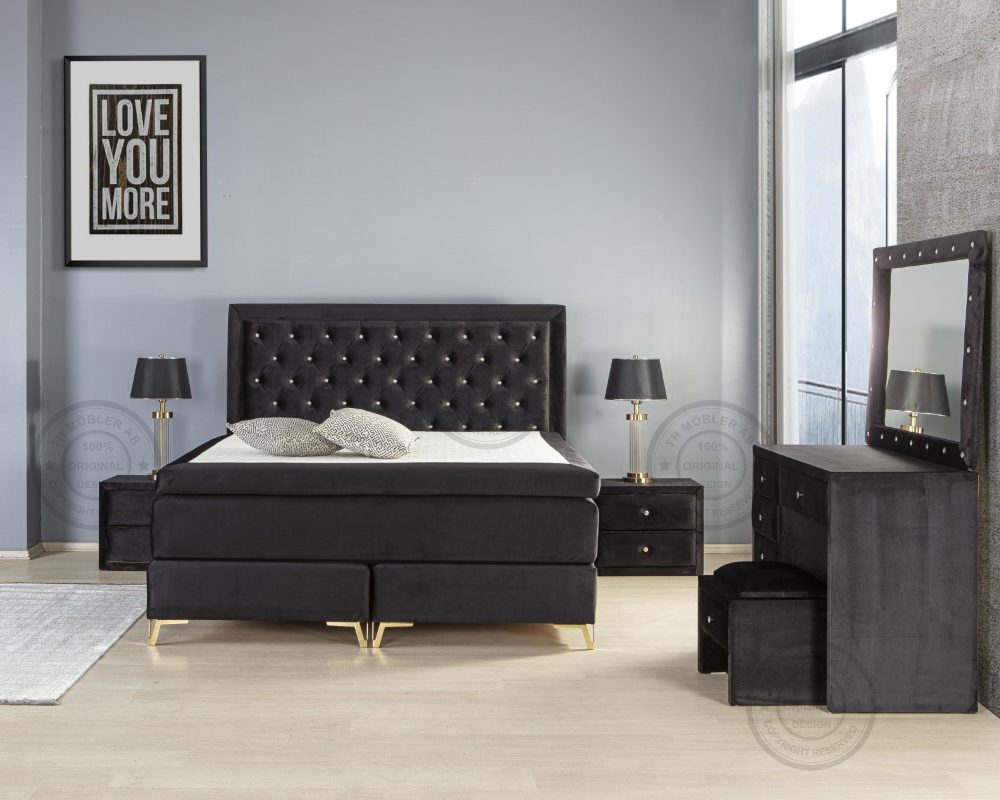 Till sängen kan ni välja att lägga till ett sminkbord med hela sex lådor, bordet följer med en stor spegel och ett glasskydd samt 2 sidobord med lådor.