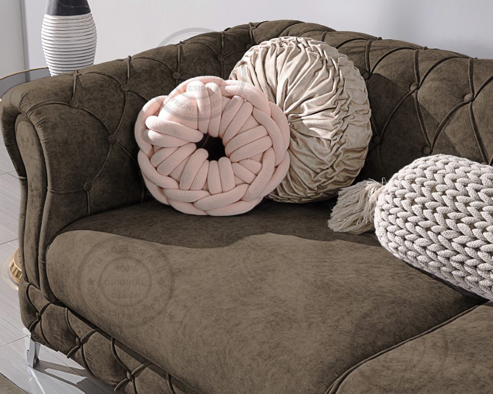 Soffgruppen består av en 3 sits + 2 sits + en fåtölj + 5 kuddar. Ni kan lägga till en extra fåtölj och eller en pall ovan i listan