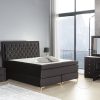 En lyxig säng med en botten del, en mellanmadrass och en toppmadrass.
