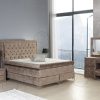 En lyxig säng med en botten del, en mellanmadrass och en toppmadrass.